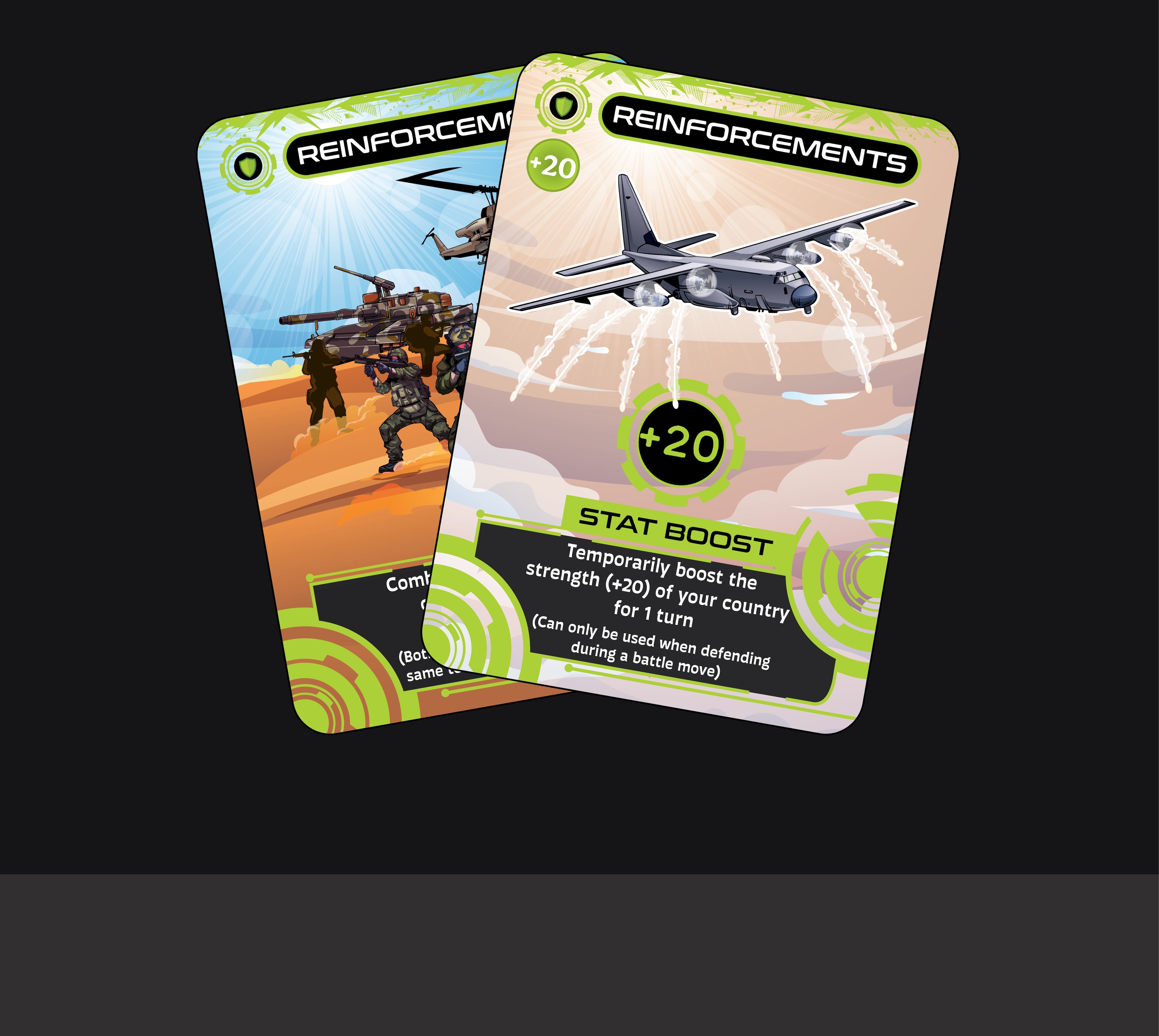 Reinforcement Cards give you the power to boost your defenses when the enemy strikes. Deploy them at the perfect moment to block an invasion, protect a valuable country and reverse the momentum of the battle.