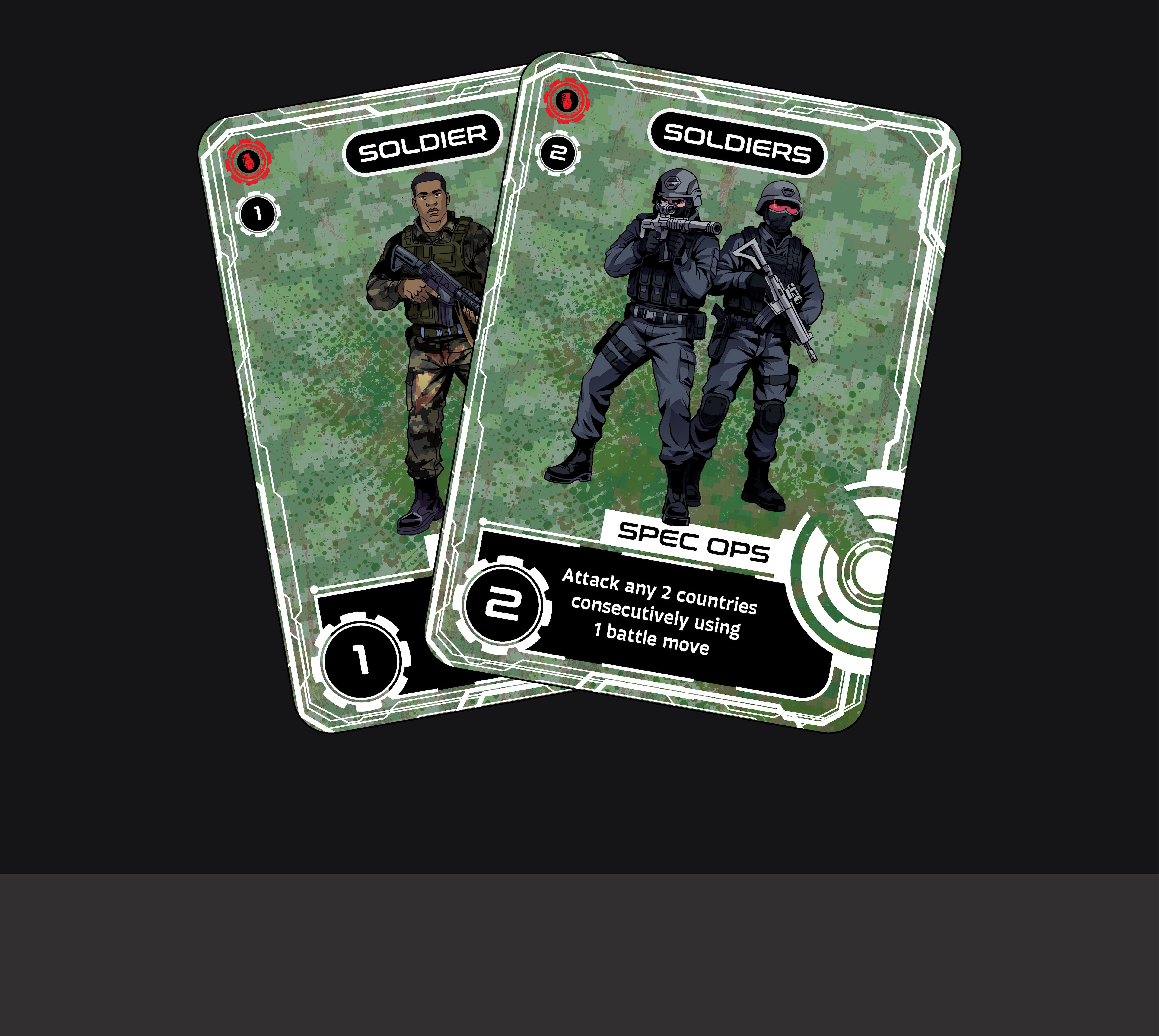 Soldier Cards form the backbone of your military might, enabling battle or boosting your attack strength when the fight begins. Deploy them alongside Country Cards to launch full-scale offensives, breach frontline defenses and push deeper into enemy territory.