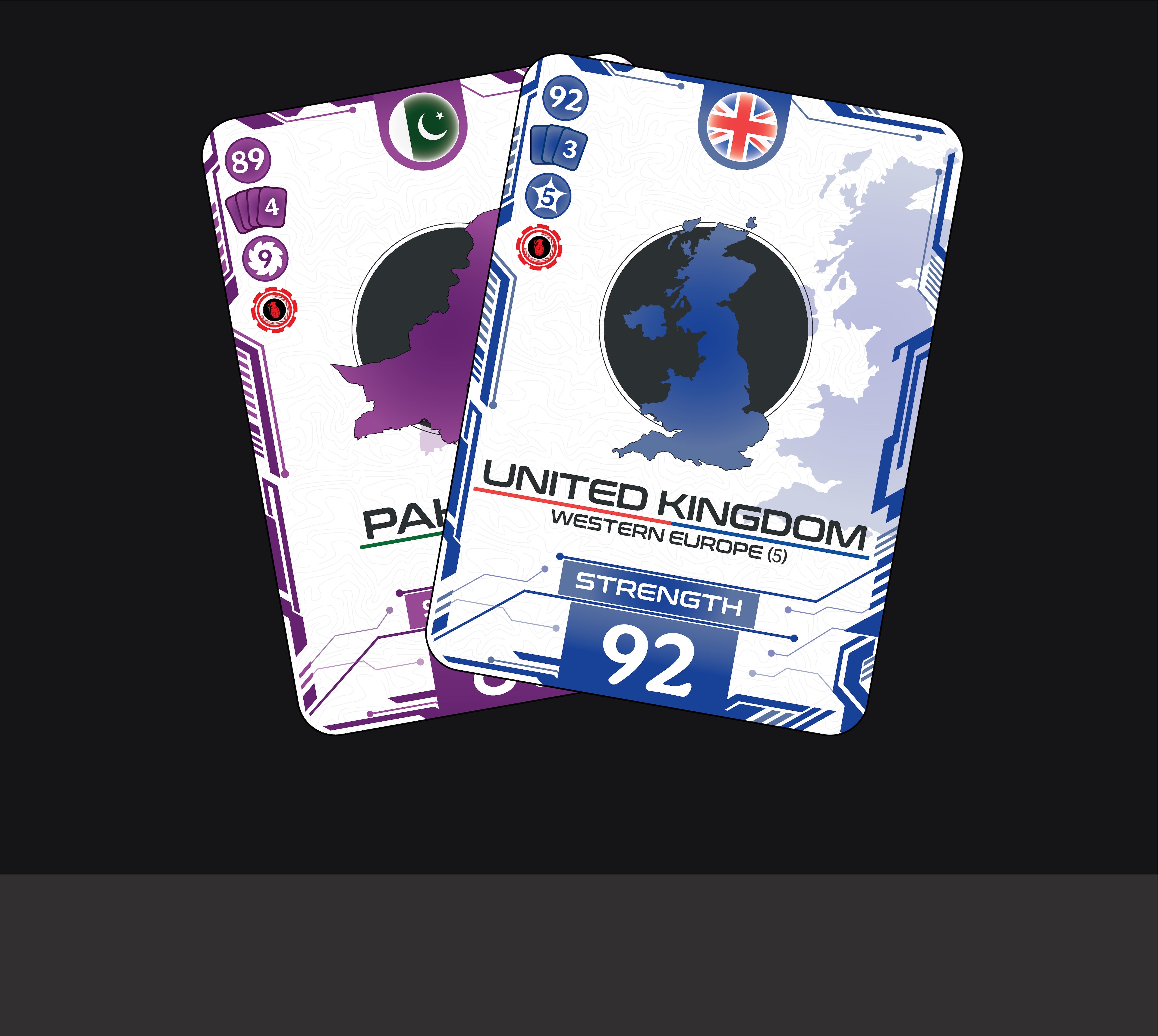Country Cards represent the nations you control. Each has a strength value and belongs to a specific region. Collecting multiple countries from the same region unlocks strategic advantages, puts pressure on your opponents and edges you closer to victory.