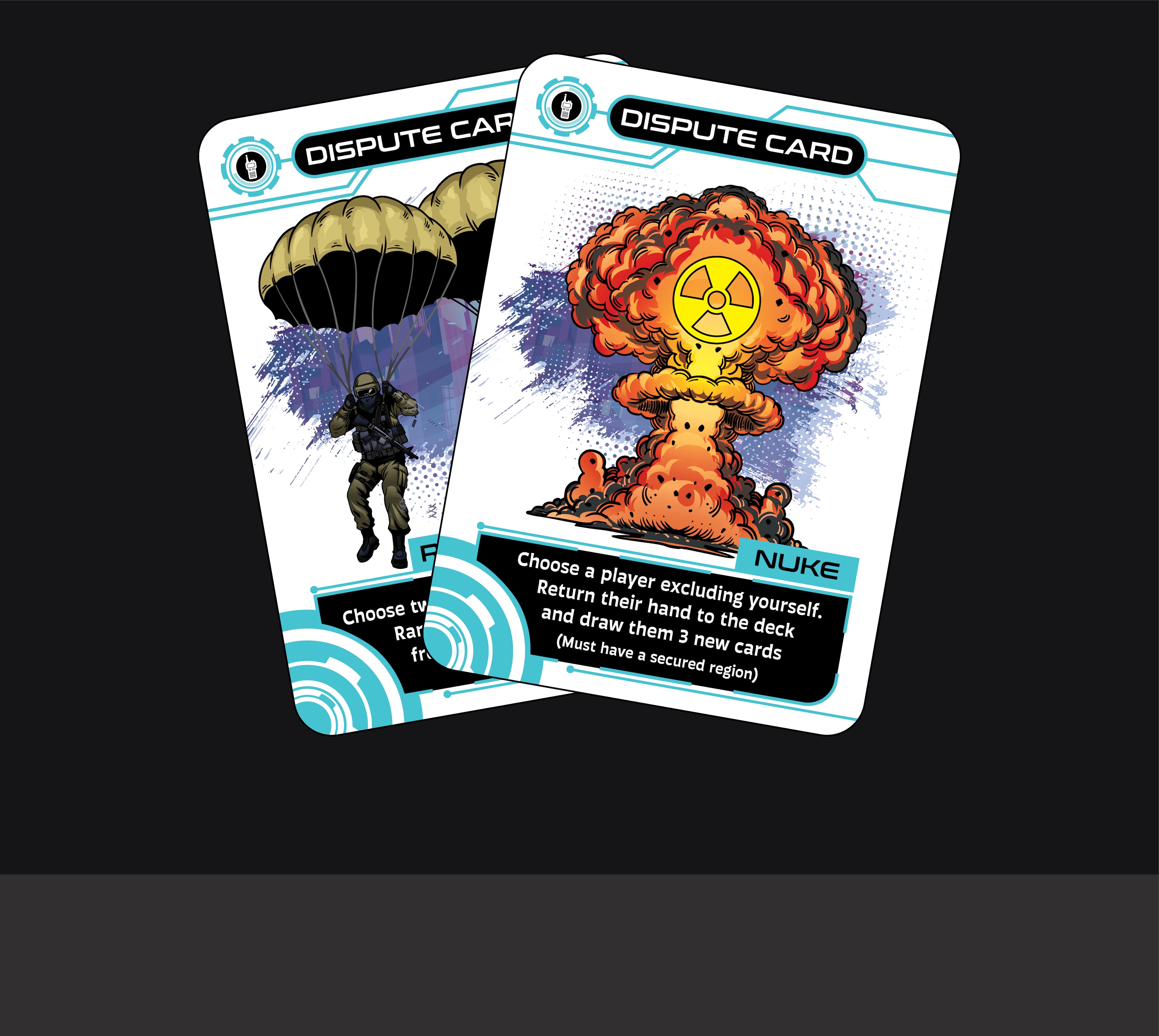 Dispute Cards are your tools to disrupt strategies and reshape the battlefield. Use them to twist the rules, steal vital assets, spy on rival plans or sabotage key moves.