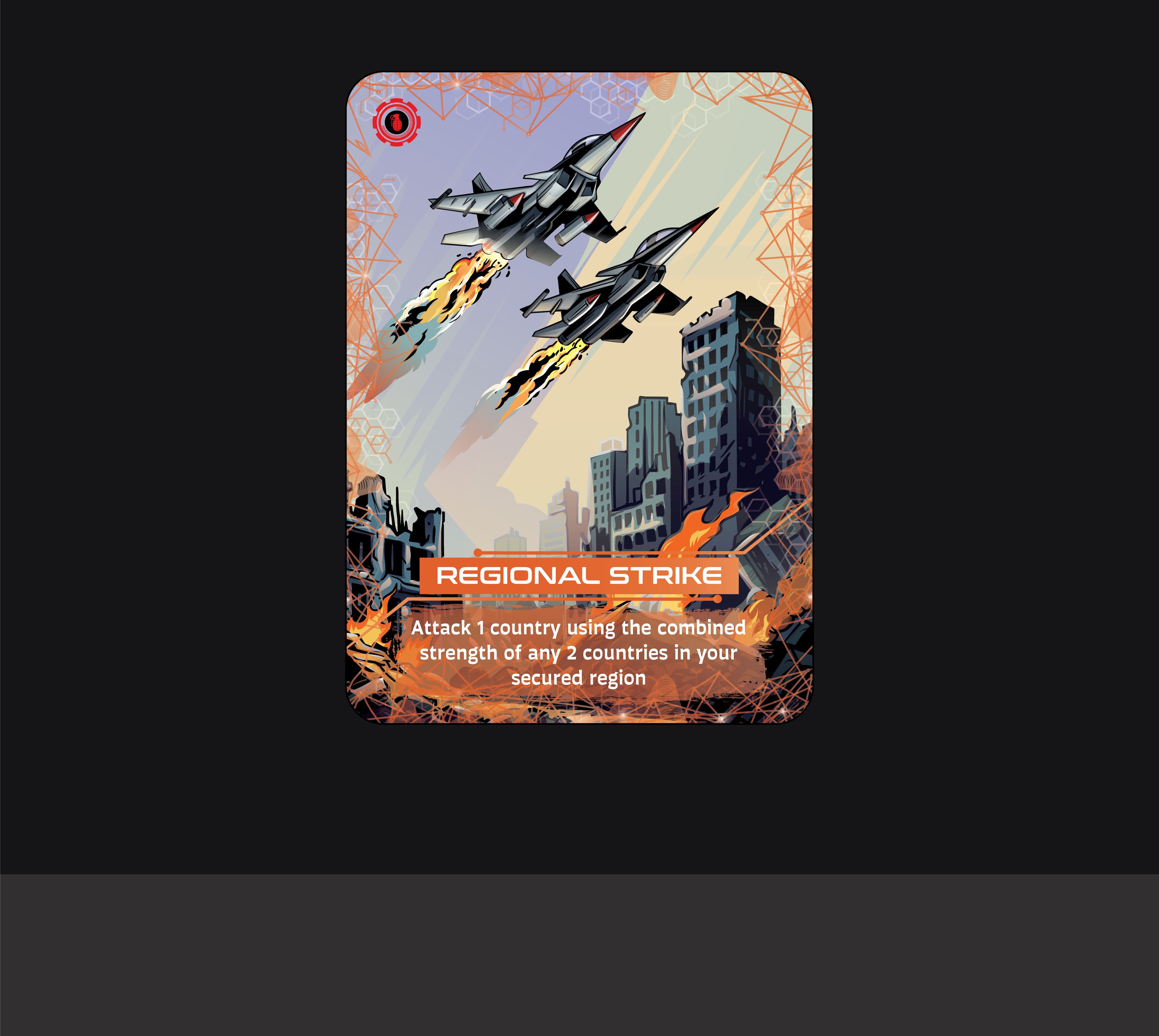 Regional Strike Cards enable powerful coordinated assaults by combining the strength values of two countries within your secured region. Unlike standard attacks, these cards do not require soldiers to initiate battle, allowing you to strike faster and with fewer resources.